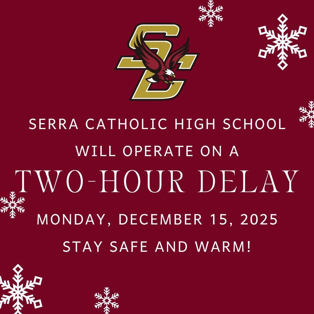 Two-Hour Delay: Monday, December 15, 2025 Serra Catholic High School will operate on a two-hour delay on Monday, December 15, 2025. Stay safe and warm, Eagles!